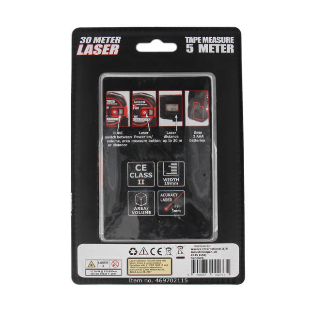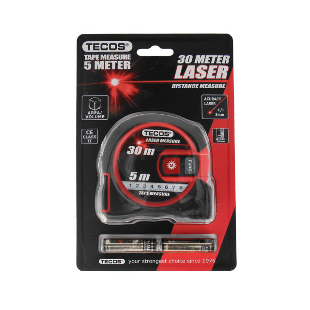Dette kombinerte målebåndet og laseravstandsmåleren gir deg fleksibilitet og presisjon i ett verktøy. Målebåndet på 5 meter er laget i slitesterkt stål med nyloncoating og matt antirefleks overflate, mens laserfunksjonen måler opptil 30 meter med en nøyaktighet på ±3 mm. Med CE klasse II-sertifisering, bakgrunnsbelyst LCD-display og mulighet til å veksle mellom millimeter og tommer, er dette et ideelt verktøy både for profesjonelle og hobbybrukere. Båndet kan låses i ønsket lengde, og endestykket har spiker-/stiftholder for enklere bruk. Leveres komplett med 2 AAA-batterier.