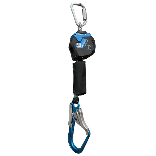 Zarges Exhelon fallblokk med 3 meter polyesterbånd, karabinkrok og Stillas-festekrok, godkjent for 140 kg etter EN360.