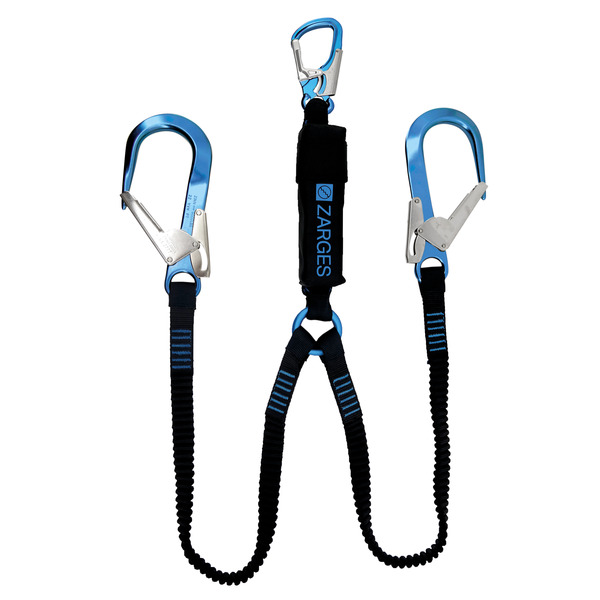 Zarges Axic Y er en solid og elastisk dobbel falldemperline testet og godkjent for 150 kg etter EN354 og EN355. Lengde mellom 140 og 180 cm. Utstyrt med O-ring mellom falldemper og line for optimal komfort, samt snap-karabin for feste til kroppsele og to stillaskroker i aluminium
